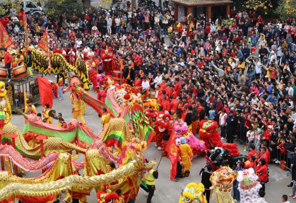 藤县龙狮大巡游活动中,13条龙身姿矫健,气势如虹,100多头狮子形态各异,或威武雄壮,或憨态可掬,它们伴随着欢快的锣鼓声,舞动出对新年的美好祝愿。除了传统的龙狮表演,今年的巡游还增设了武术队方阵和牛歌戏队方阵。
