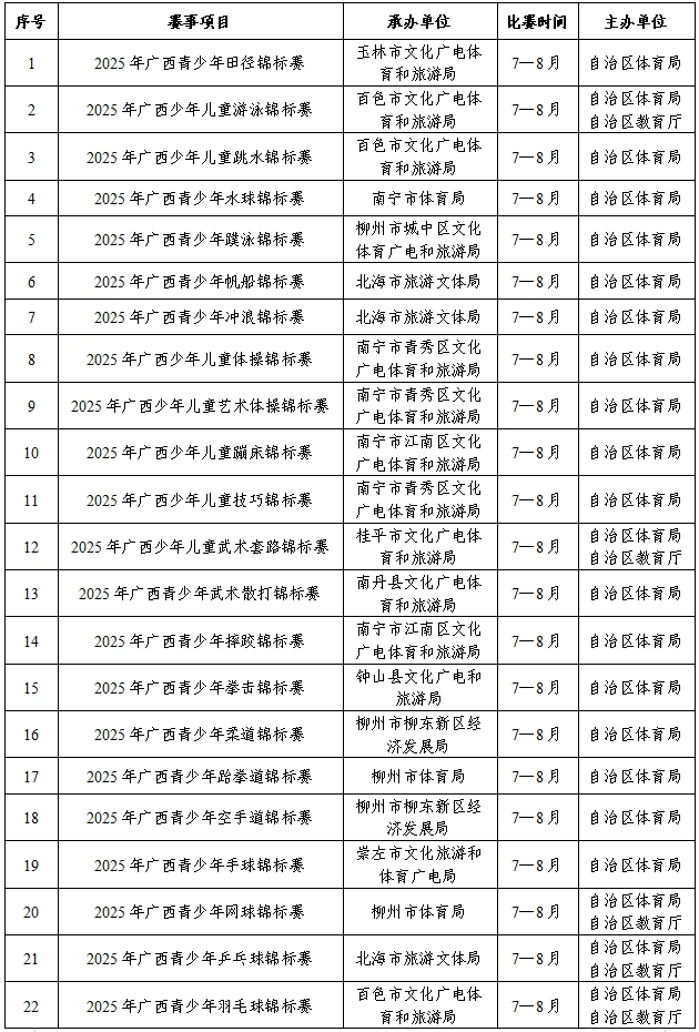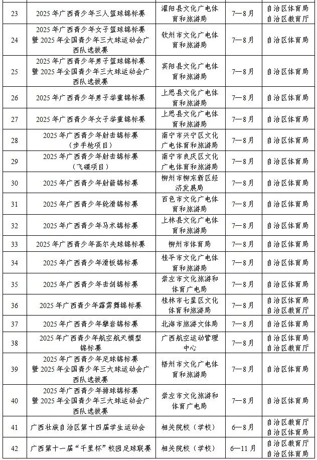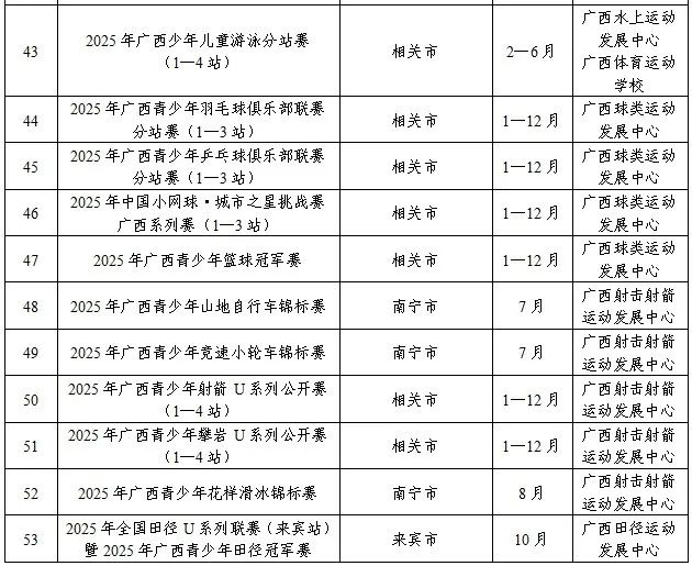 为丰富青少年体育赛事供给,进一步深化体教融合发展,营造全社会共同支持推动青少年体育赛事活动的良好氛围,通过赛事活动发现选拔一批优秀运动员及苗子,2025年,全区计划举办53项各类青少年体育赛事(不包含各市举办的赛事及市场主体举办的赛事)。整体赛事都安排在暑假举行,部分赛事持续整年进行。