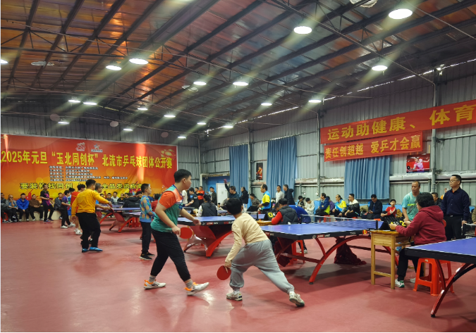 近日,2025年元旦“玉北同创杯”北流市乒乓球团体公开赛圆满落幕。本次赛事分小组单循环和交叉淘汰赛两个阶段进行,每场比赛打满5局,按单打→单打→双打→单打→单打的比赛顺序进行,吸引了来自北流市各单位、学校、体育俱乐部等20多支队伍100多名运动员参赛。