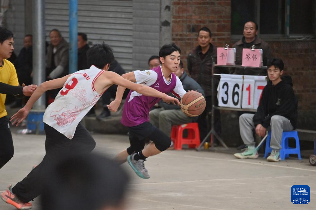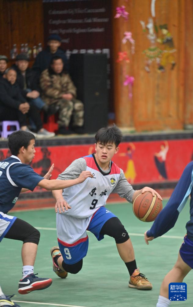 在广西柳州市融水苗族自治县洞头镇洞头村,村民在村级篮球赛中带球突破(2月2日摄)。
