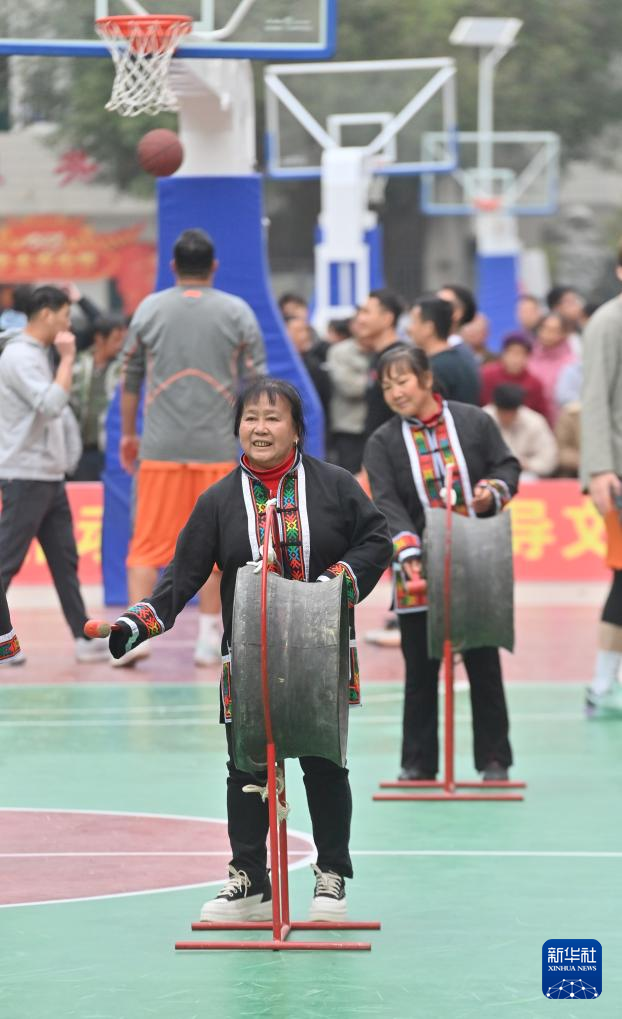 在广西河池市大化瑶族自治县板升乡乡级迎新春篮球赛中场间隙,当地瑶族群众在展示铜鼓文化(1月20日摄)。新华社记者 黄孝邦 摄